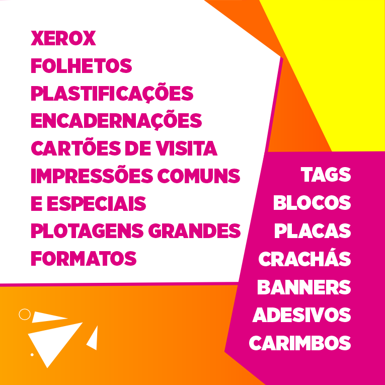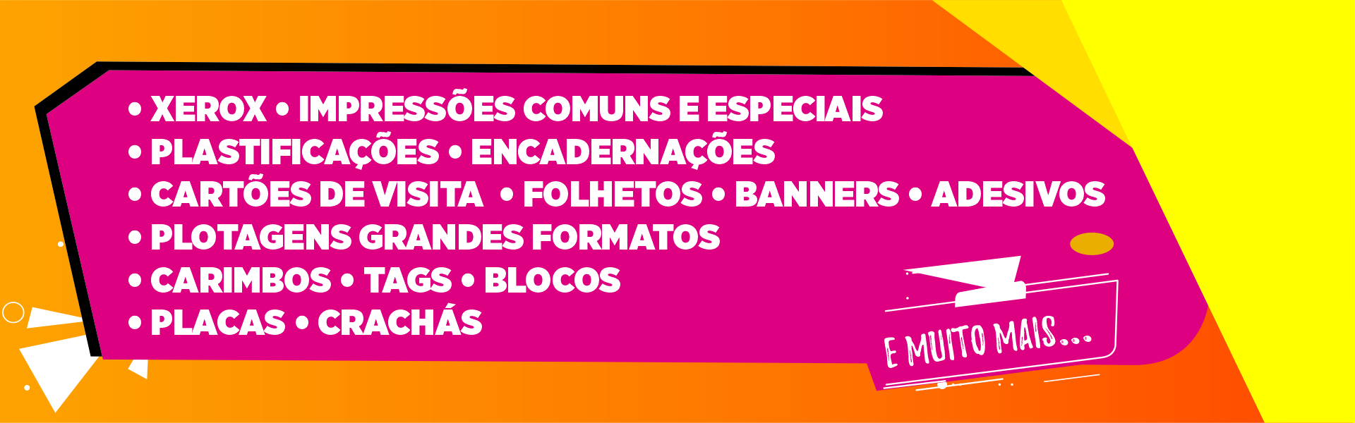Oferecemos uma ampla variedade de materiais: apostilas, adesivos, agendas, banners com entrega no mesmo dia, calendários, carimbos, cartões de agradecimento, cartões de visita, crachás, imãs, tags, panfletos, folders, folhetos, entre outros.